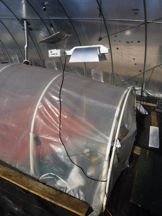 However, since the plant was stared a month early, to supplement light a 630watt CMH (Ceramic Metal Halide) light will be used. Ropes attached to the main structures hoops and ratchet hangers will allow for proper positioning.