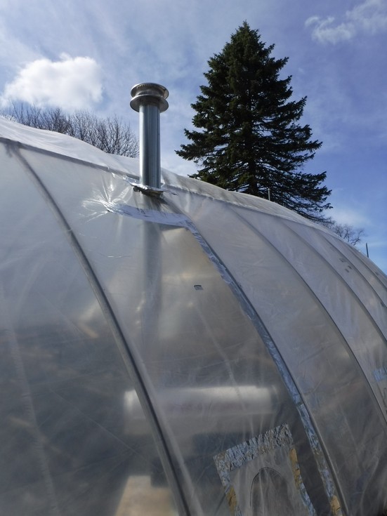 While the rain cap may only need to be at least an inch from the plastic, there were some unknowns when mounting so the longest (five feet) exhaust pipe was purchased. This resulted in the stack being a little higher than originally thought, but there is no negative of this extended height so no need to make any extra modifications. It also helps ensure that even if the plastic moves in the wind there is no chance of it coming in contact with the exhaust pipe.
