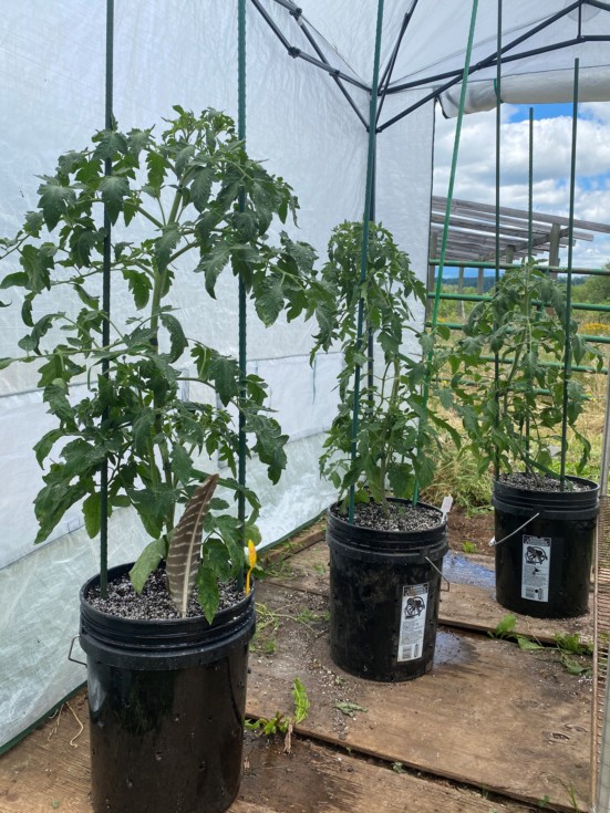Five gallon bucket challenge plants. Never seen anything like it. Just planted them two weeks ago and they are up to my chest. From left to right: 6.66, 7.64, and Bezrazmernyi Russian Heirloom. The first large megablooms are now emerging and should be open in 5-7 days.
