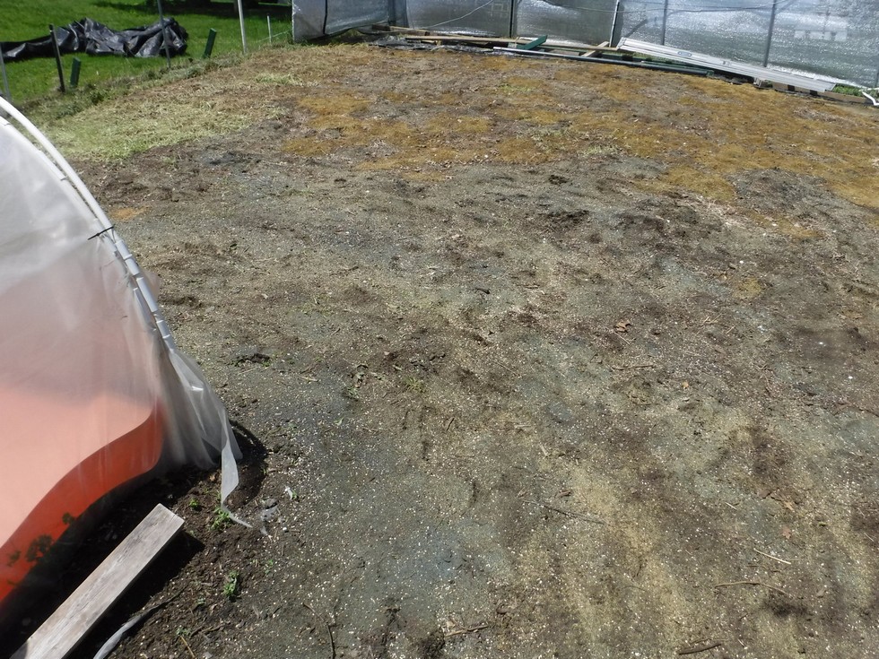 The same process was carried out for the indoor plant earlier in the year but the mid-day sun during the applications for the outdoor plant shows the soil surface well. Weed black is laid out well in advance to kill and of the weeds and grass that starts growing. This results a nice clean and level soil surface for amendment applications.