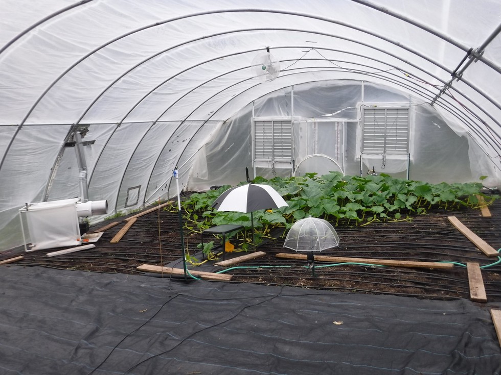 The clear umbrella is the location of the CO2 sensors to keep them dry because there is a mister that comes on 5 times a day to help offer some cooling and humidity to help maintain soil moisture. Based on the look and feel of the soil while vine burying the irrigation system seems to be working out well.