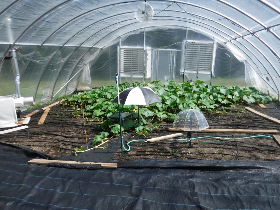 Looking at the plant in the image there is no indication how hot the temperature is. All of the plant leaves are turgid, soil surface is moist and there is no burn. This is a good sign that despite being in the plastic structure all systems are working together to help maintain good growing conditions with minimal stress to the plant.
