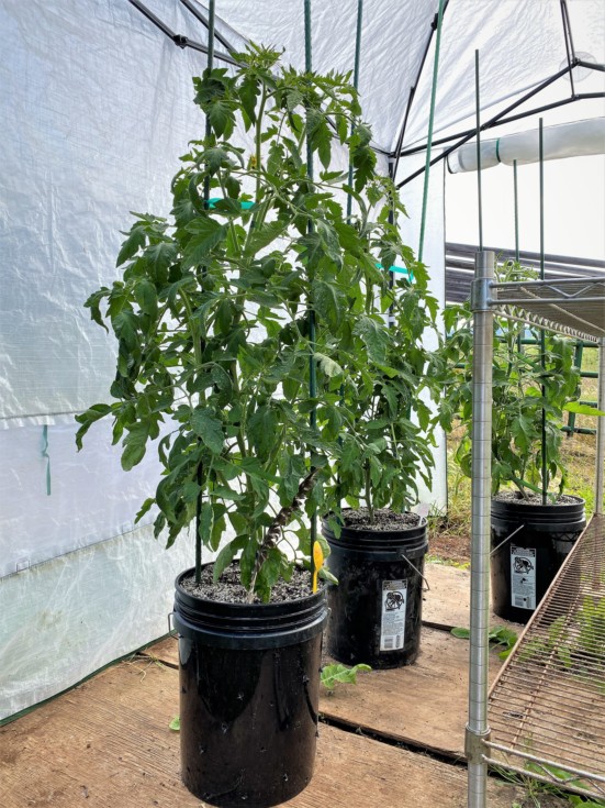 Bucket challenge going well! Still can't believe how well these things grow in a 5 gallon bucket. Nice first truss megablooms on the tops of all three.
