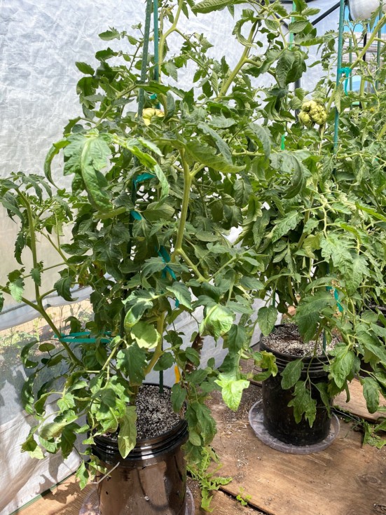 Reality is never too far away. The three 5 gallon plants. One tomato has a healing BER, one is growing OK, the other hasn't pollinated yet.