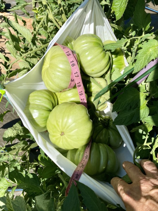 Most of my excitement hasn�t been on individual tomatoes in the garden, but the unexpected. Like all these on one truss! Eleven all together. The one at the bottom is over 20�. From the 6.66 Big Marley. Being it�s second year out as a cross you get all kinds of anomalies. I�ll take this one and grow it again next year. Not just this truss, but all the trusses were mega sized. I cut them off to feed this one.