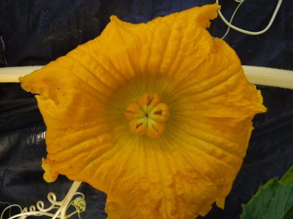 Overall nice looking (symmetrical 5-lobe) flower. This will be a self cross because the outdoor plant is not at the stage of producing male flowers as of yet. Since each plant was stared a month apart self crosses were going to be the likely result, but given the opportunity a sibling crosses would have been made.