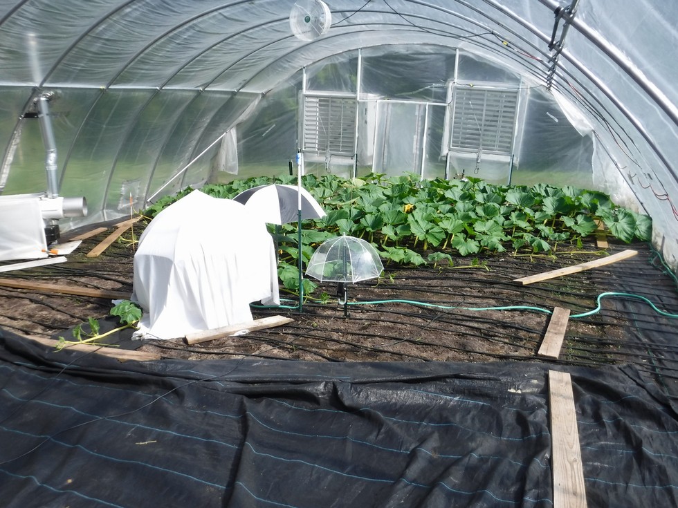 The indoor plant received its Anthesis treatment this morning (48 hr post pollination) and there is a white sheet on an umbrella to offer shade on the pumpkin but still allow for air circulation. The clear umbrella has the CO2 sensors which have a built in photo cell to allow dosing only during daylight so this is the reason for the clear umbrella. The intention is to protect the sensors from water (misters) and still have exposure to unfiltered light for proper dosing sequence.