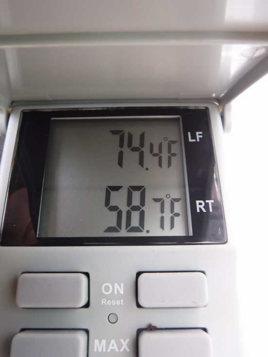 There is a comparison of the inside and outside temperatures at about 9:30am. With the plant already being exposed to 74F (23C) temperatures this helps ensure a quick start to the continued exponential growing process with minimal slowing. Compared to the outside temperature of 58F (14C).