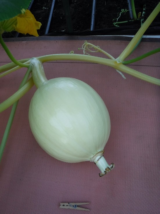 Here the pumpkin continues to grow and it is continually being moved to reach that ideal 90-degree angle to the main vine. Looks like it will be a long-ish shape.