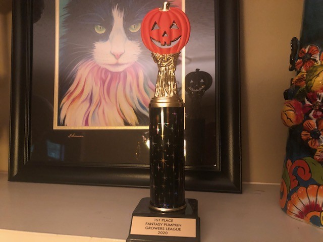 With my season ending early, I had more time to spend at the administrative offices of the Fantasy Pumpkin Growers League or the FPGL. The winner of our inaugural season will receive a super cheesy trophy along with cash and seeds. While it is not a hand whittled award, I like the 80's starburst roller rink stars barrel and of course the pumpkin on the top. If the season ended today, Mikkal Hodge would be the winner, but then again only one site has reported in with the GPC. Good luck to all of the team owners.