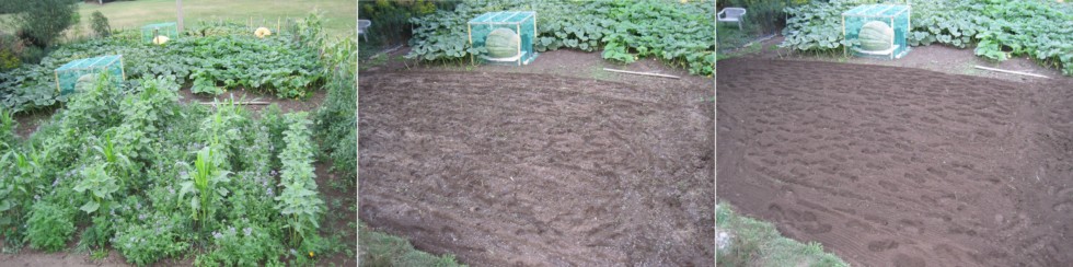 Today I did some green manure work on the patch. From left to right: 1) You can see the sunflower/corn/phacelia/rye/pea...and others stuff green manure. 2) After mowing, addition of some compost, a first shallow pass with the tiller, and then sprinkled with some dolomitic lime, horn chips and calcium cyanamide. Finally 3) after a second (deep) pass with the tiller.