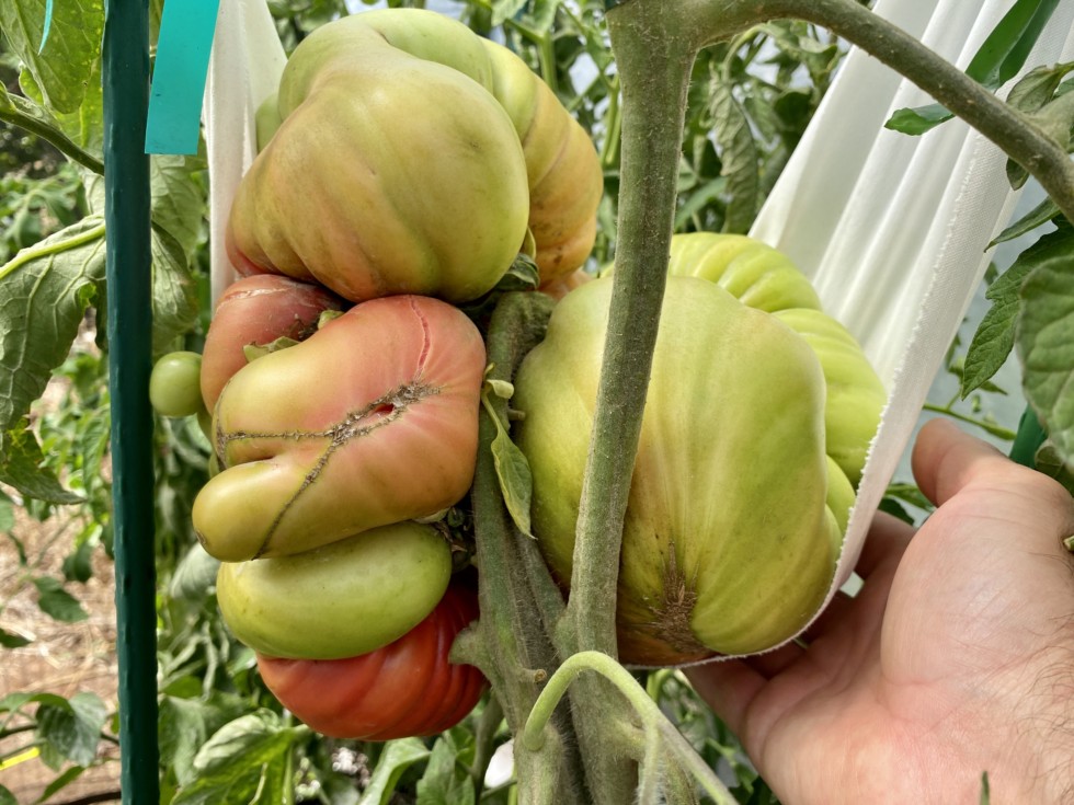What a journey coming down to the wire! Will it beat Doug Smiths 6.85? Probably not. I don�t know. It�s 27� x 25.50� x 19�. Do the math. Too many spaces. I have been giving it more water trying to swell that baby up. It�s working as there are starting to get cracks in the flesh. Risky, but that�s what I gotta do! Crazy mutant tomato.
