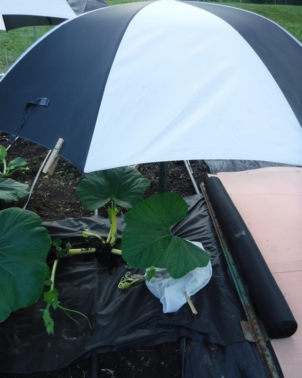 As if the protection around the actual pumpkin is not enough there is additional exterior protective measures in place. The main one being an umbrella to offer shade from the sun in addition to helping keep the area dry. Also, this can help provide the main support for a white sheet that can provide extra shade and does not have to come into contact with the pumpkin.