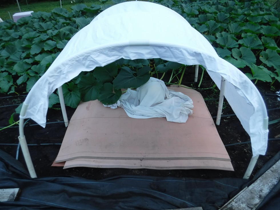 This essentially double layer system not only shades the pumpkin but also can help reduce the heat directly applied to the pumpkin which on 90F+ (32C+) days is beneficial to help reduce the chance the pumpkin internally �cooks�.