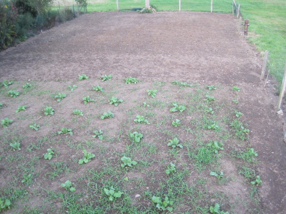 Green manure report: In the front you can see the green manure sown in early September (rye, vetch, clover, oil radish), and the rest of the patch (upon picking the pumpkins) also got some green manure sown (about a week ago).