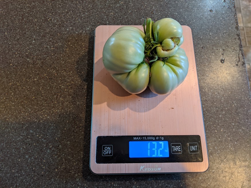 First cull off the bucket plant is the double caterpillar. Officially gets me out of last place with this one weighing 0.825 lbs. Should be just a placeholder with two more to go on the plant. Will make the next cull next week.