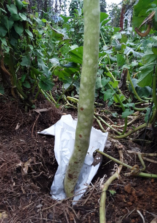 My long gourd was doing great until the rain-splash got some kind of bacteria or fungus on it. The part near the ground was the only part of the gourd affected... so I assume this was the issue. Its about 90 inches its about tied with my previous personal best. I do like gourds. They are fun.