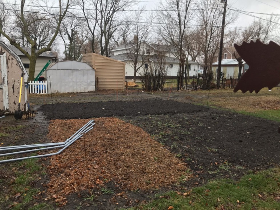 Here is a shot of my patch. The worked area, I added 1/2 inch of Coir, 1/4 inch of composted manure, and 1/4 inch of compost, then turned it over with a potato fork. I have some more amendments to add in the next few days, then will shallow till with the Mantis. This is where the greenhouse will be erected. The area with the leaf liter covering the surface will be a giant cantaloupe, and the remainder is yet to be decided. I will cover that area with leaf litter too. Amendments yet to be applied include: 20 lbs humic, 25 lbs kelp, 5 gallons worm castings, 25 lbs alfalfa pellets, and 2 lbs myco. I will use some ammonium sulfate at test recommended rate and balance out the N with urea. I have the boron and manganese on hand and will slurry and apply in a gallon of water over the entire patch. A little triple super phosphate and of course elemental S will also be added. Going with a landscape fabric and straw blanket as an artificial mulch. Drip lines will be put down under the mulch before covering.