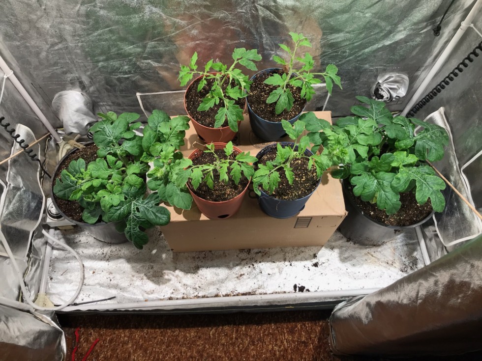 Watermelon on right 315.5 Kent, on right the 318.5 Kent. Watermelons are 3 weeks old. The two tomatoes to the front are 6.32 Borgers and the two toward the rear are 7.66 Hills. Tomatoes are 2 weeks old.