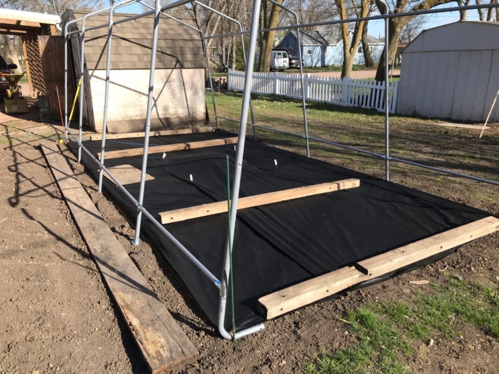 Landscape fabric down. I will cover this with straw blanket for the watermelon tendrils to grab onto and stay in place..