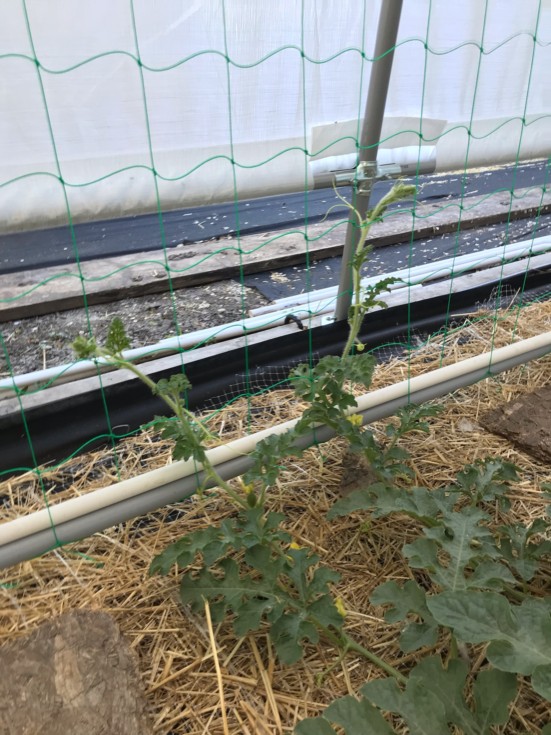 Vines starting up the trellis I hung on the north side of the greenhouse.