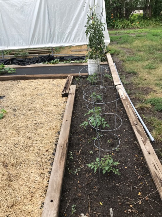 A row of 7.66 Hill, I don't know the variety, but 7.66! The 5 gallon bucket Hill had a 4 fused mega, but did not set and a couple got BER, eating tomatoes from now on for that bucket. The tomatoes in the ground are cuttings from the 5 gallon bucket plants.