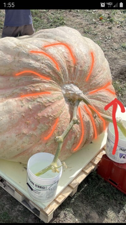 Looking at the blossom symmetry on the 2702. It does have the extra bit on the far side, like an extra segment that wedged in, before I figured these rare partial segments were an indication of an underdevelopment, but since we are talking about the WR, I think its safe to call this an EXTRA blossom blip. Or, to argue the opposite, maybe this 2700 lb pumpkin is really an underdeveloped 2800 lb pumpkin...