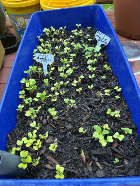 Val and I went a little crazy with grow boxes on the deck but it�s fun to see anything grow. Royal purple and French Dressing radishes coming in.