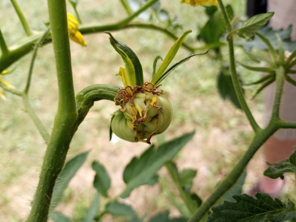 One of the megas I hand pollinated a few days ago seems to have taken. It looks to be a 5 fused mater if you count the stigmas. This mater is on the same dan s. plant as the other huge mega im trying to pollinate. probably going to have to make some tough choices in a few days if the other one takes. The temps have been in the high 90 to 100. I've read that temperatures that high restrict pollination. guess we will see. The doner flowers are still producing plenty of pollen when I buzz them.