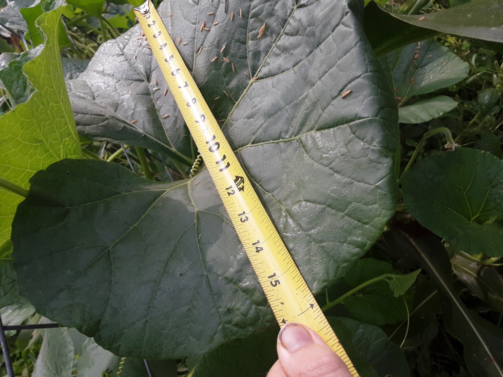 Done with pumpkins. ...but I want to document my long gourd. This is by far the biggest leaf I've ever had on a long gourd, and its just a few nodes from where I have a decent little gourd... a sprinkle of corn tassle droppings on the leaf.