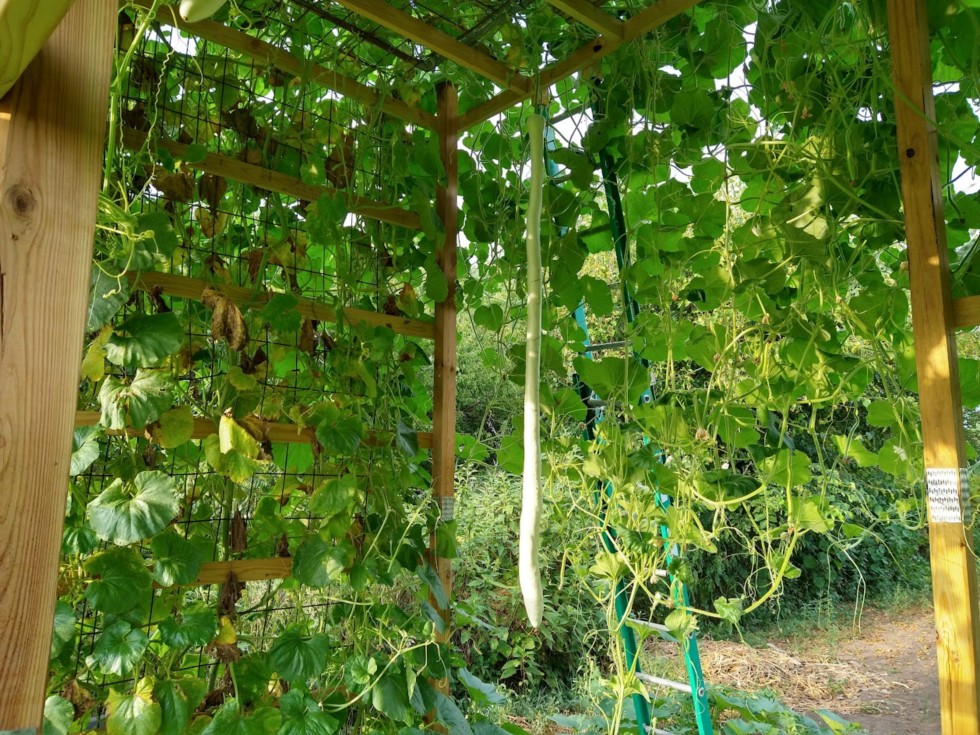 Long gourd made pretty good gains while we were gone. Was probably only a couple feet long when we left, now in the 7 foot range. Have a decent one coming along on the 131 Tobeck as well. Looking at the trellis looks like there's a lot of work to do removing culls this week.
