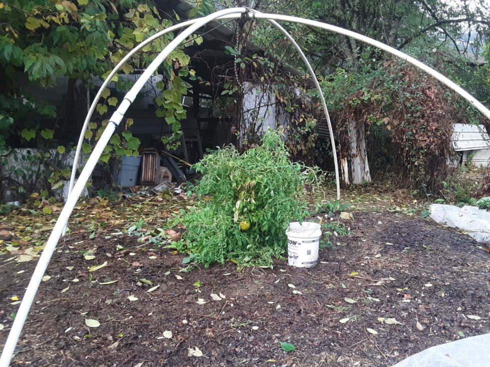 Our recent windstorm blew the cover off the "lemon tomato" plant so I decided to take a picture. Very poor seed germination with these, but it bred true-to-type... Some of the tomatoes are lemon shaped and one is turning yellow.