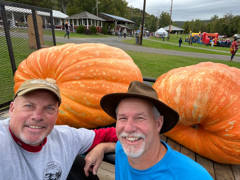 Well hmmmm when one of the bigger pumpkins weighed in at 954 I was thinking we were not winning this year as it was hard to measure mine and when a soft spot was discovered on the main I knew it hadn�t grown in a couple of weeks. I also didn�t know what the divot and the caved in bottom would mean. I was thinking the low 900�s was where she would settle. She was last on the scale and boom 977. She went heavy and earned the King for the day. My Honesdale growing buddy Andy was over the moon at witnessing the victory. Lol a good day was had.