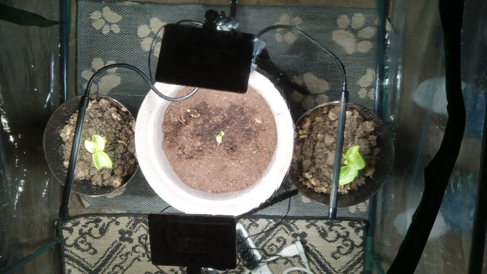 We're rockin and rollin now. True leaves are appearing on the two that are fully up and the middle one (two days behind) should be opening probably tomorrow. The Weston (not in the pic) is closer to the heater now. Another possible reason for it's slowpokiness is it was farther away from the heat source than the others. It is starting to crack though so just a matter of time. As a new(ish) grower I'm constantly evaluating what I'm doing. In this case I decided to put the 'gooseneck' lights right on the two frontrunners to keep them from getting too leggy. As far as the other one goes, it is it what it is because I don't have shorter stands for them.