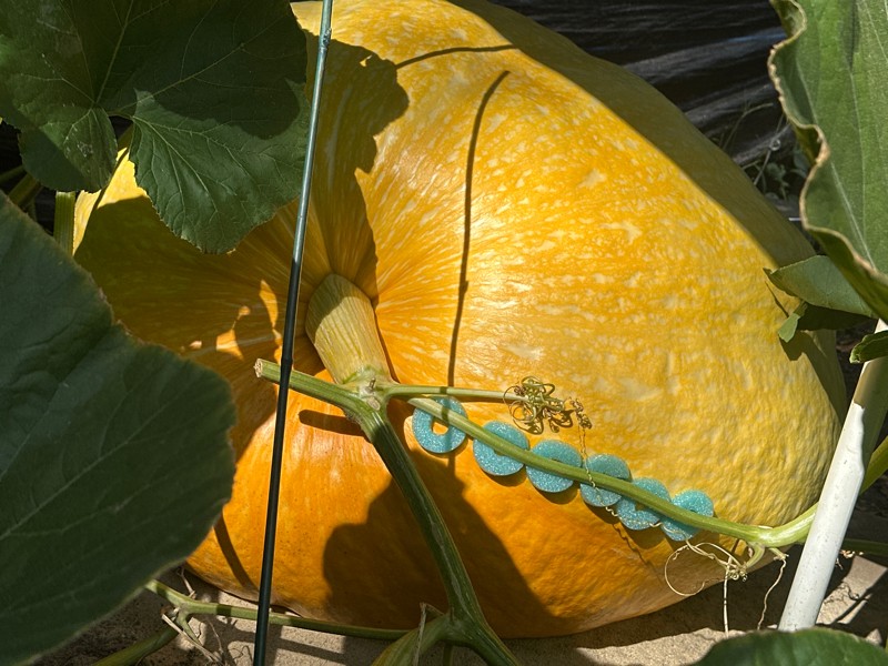 My 1349 is blowing me away for this late in the season. Average is 16.5 pounds a day. The pumpkin is young though at 47 days old. Average weight of 500 pounds today! Also, Sunday was the first time I measured this thing. Willing to bet it was doing 25+ pounds a day at its peak. The 2020 Paton was doing 19-20 a day at its peak but it is important to note that the 1349 has several more hours of sun than the 2020. The sun may be a huge factor with gains. I also will need to feed more often next year. Those foam pieces against the pumpkin are for that secondary vine. There is no slack at that point and probably could've done a better job when it was smaller with positioning it. May need to cut that vine off as it is very tight against the pumpkin