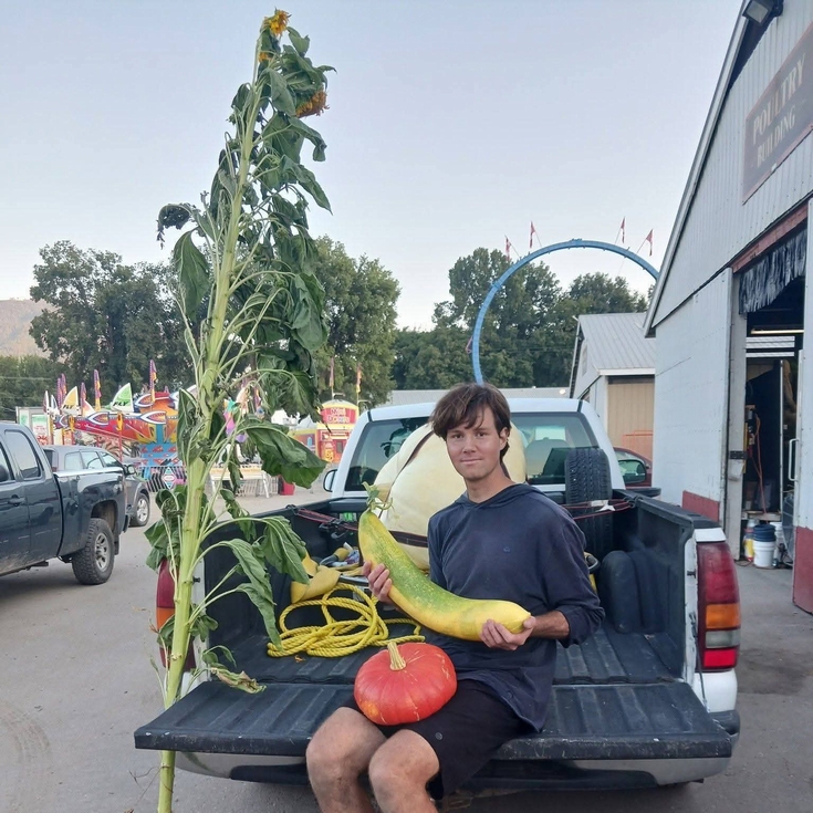 I forgot to mention the results of some things I grew for our local fair at the end of August. The 2702 cutrupi behind me weighed 397 lbs, the cucumber was 12 lbs, the sunflower was 12 ft, and the gourd on my lap was ornamental. Nothing record breaking but I mostly just grew them for fun.