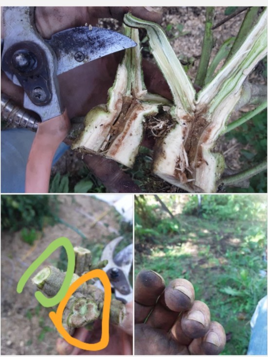 The 8 lb tomato was grown on the SICK (brown) side of this vine, circled orange. The others (5 lb and 6+ lb?) I just picked were off this rotted out stump plant. The plants can have some rot and still produce decent tomatoes. But the more diseased the plant is, its harder and harder to tell what the plant actually needs, nutrition wise.