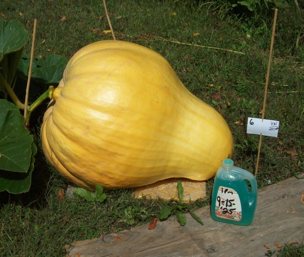 I started in with a 'one fruit per plant' policy this year and I really like it. They just take off seemingly faster with the plants all to themselves, I guess. I also feel that any malnutrition is felt by the sole fruit less than if there were many others. I used to do three pollinations standard and cull down to one eventually, but I never knew which one was gonna be the 'keeper'. This reduces that stress. This is a SecOnd 'only child'; The first was quickly big & I was like 'WOW', butt I think it wasn't getting enough 'goose juice' to be sustained, and it was right about when I had slacked off...or not yet increased... on The Ferts, lol. My plants live paycheck-to-paycheck and that was not gonna fly.  All good now, though.  'Lessons/Lesson's learned', lol---eric g PS---I just today put more stuff under the snout.  It was not that easy, lol. PS2---This is offa my 236 seed (1007 Brown X 2145 McMullen). ***The final weight was 379 pounds.