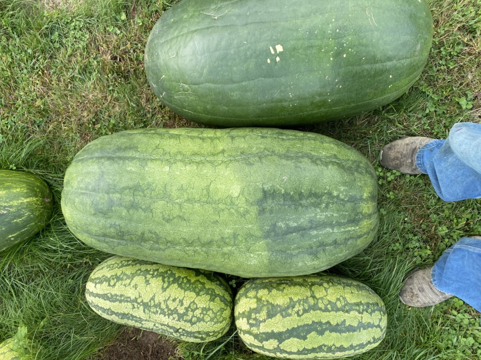 These were the two melons I brought to the Durham fair. They are Tom Watson crosses. They are pictured next to 2 30 pound jubilee melons  Final measurements on the long melon 57 inches end to end, 38 inches side to side and 91 inch circumference for a total of 186 inches.    on the black melon end to end was 53 inches, side to side was 39 inches and the circumference is 82 inches for a total of 174