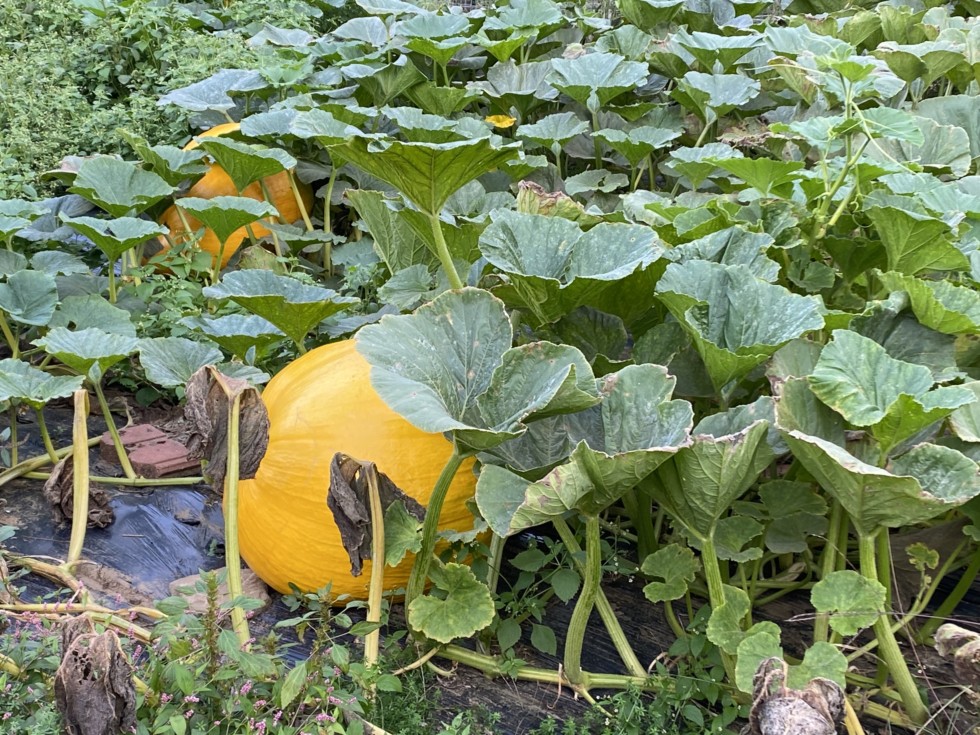 This is the 1668 Ciesielski plant that my son Abel grew. After his big Pumpkin went down to a stem split. He let it produce many many new pumpkins. This neglected plant still looks pretty good.