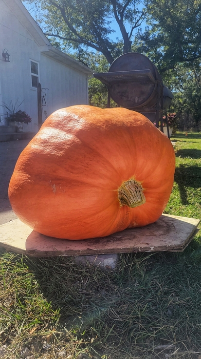 Last fall Matt Radach offered a few of his seeds and my 15 year old niece in Missouri grew his 977 seed over the summer. If I lived closer she'd have had a bigger pumpkin in the end but for a 15 year old's first time, and next to zero help from any adults during the growing process, it turned out well. Best of all, she wants to do it again next year as a FFA project. She was having trouble deciding on a field of study for college with an agriculture tie in. The pumpkin growing, and going to a recent farming seminar with my sister and brother-in-law via the extension office, has her leaning toward agronomy.