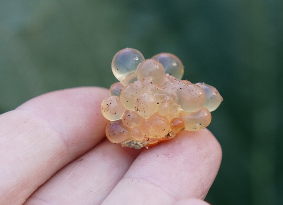 Here the cluster of pustules can be seen after being removed from the pumpkin. While they may look soft, these are actually hard to the touch and seem to be filled with a jelly-like substance. The origin source seems to be in the actual rind of the pumpkin where it meets the surface skin layer.