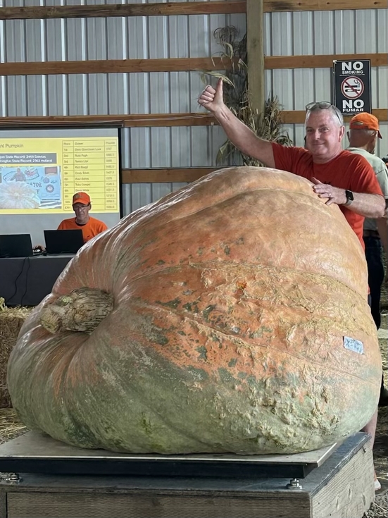 My beautifully ugly pumpkin, "Cracker" was weighed today at Bauman's Farm.  It weighed in at 1699.5 pounds and placed fourth.  That's not bad for a pumpkin I basically ignored since August 1st so I could give my bigger ones more attention. It was a nice day at the PGVG's first weigh off of the season. Congrats to Jon & Annie Sestak on their win!