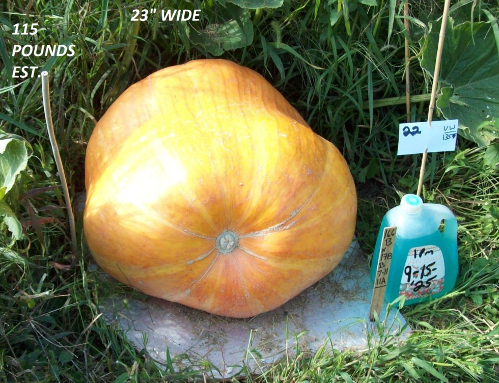 My #22, 166B fruit, further exemplifying that if a fruit is gonna be smaller, it is more likely to be orange, OR there is a nutrient difference between the two main patches that is affecting the color potential. Hmmm, however, I did have a 166A & 166C growing, as well;  They were creme-colored from the start to their just-88-pounds, and huge birdbath, finishes.  I'm happy either weigh---The 88-lber sold VERY early-on! eg