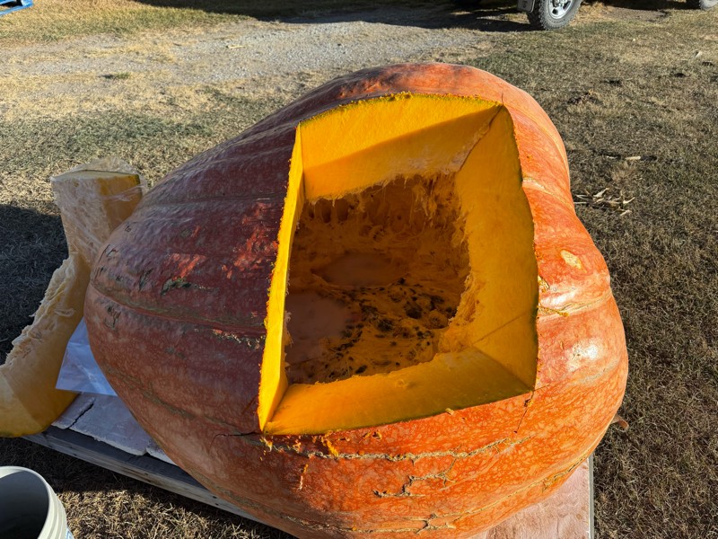 Had to open the 1368.5 for seeds. It got infected at a bit of strap damage on the bottom and rotted through in one spot. Very thick front, the rest was above average but super dense. I had a difficult time penetrating the flesh with the saw. Not a huge haul of seeds.