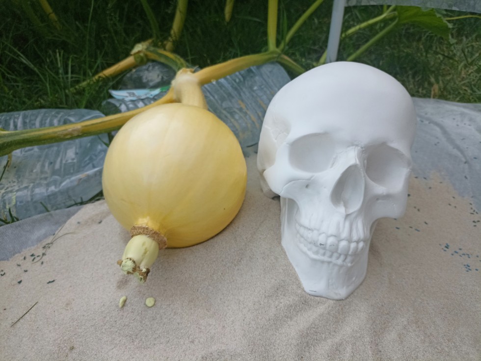 Gorky Park started producing female flowers very quickly. But I was waiting for *the one*. On June the 5th, 2025 day of pollination. It was self-pollination, following all the rules of flower isolation. Within a couple of days, the fruit was the size of a tennis ball, and in 10 days - the size of a child's head. I had never seen anything grow so fast! It was incredible. I put a plaster skull next to the pumpkin to see the scale and growth rate. At DAP 10, I placed the fruit on sand to drain excess water. And there was a lot of water. June was cold and rainy. There was no sun at all, and daytime temperatures were only 11-15 degrees Celsius. That was very cold! And there was no way to treat the leaves from pests and diseases, because it was always raining.