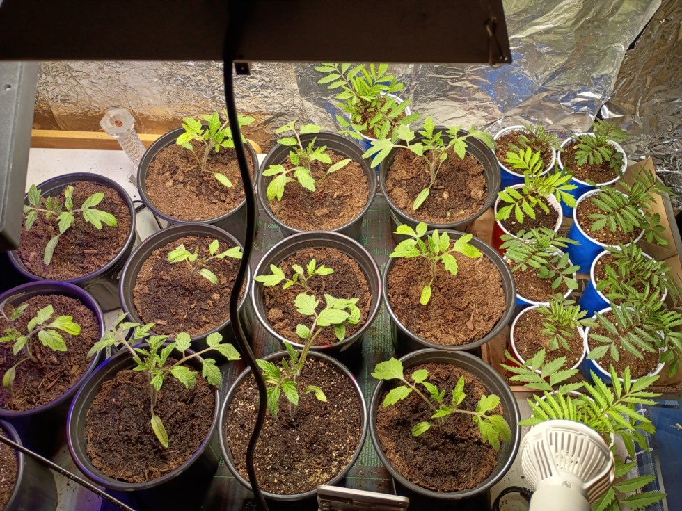 Sutherlands and marigolds are alive, woohoo! Outside in sun all day for first time today, baptism by fire!
