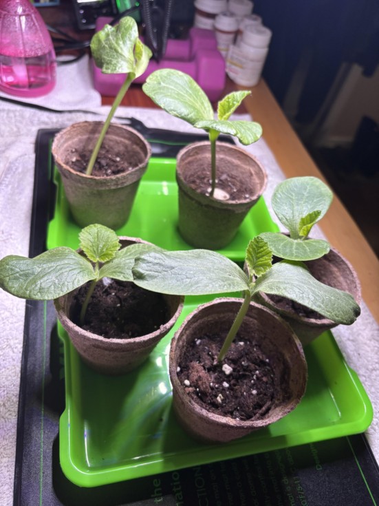 Well, I had intended on planting the seedlings this weekend but the heat overpowered me and my husband and we ended up doing less work around the patch then I had anticipated. The ground is ready to go, but we have a lot of brush around the patch that's blocking some of the sun so we had intended to get it cleared out this weekend so that the seedlings can have all the direct sunlight possible. Unfortunately, it was a lot more than it seemed so we did about half of what I had hoped we would. We had actually intended to do it this past winter while it was cold and everything was dead, but again, chickens. So we're a little behind on some things. The expectation is that we'll finish up the work this afternoon and I'll be able to plant the seedlings by this evening. They're looking really good though, first true leaves are thriving all around and second leaves are beginning to pop up, roots out of the peat pots are still not bad so I'm hoping they'll be able to handle one more day! I can almost hear them when I walk by going, "Plant us!!" and I catch myself promising them that I'll get them in the ground today or tomorrow at the latest haha