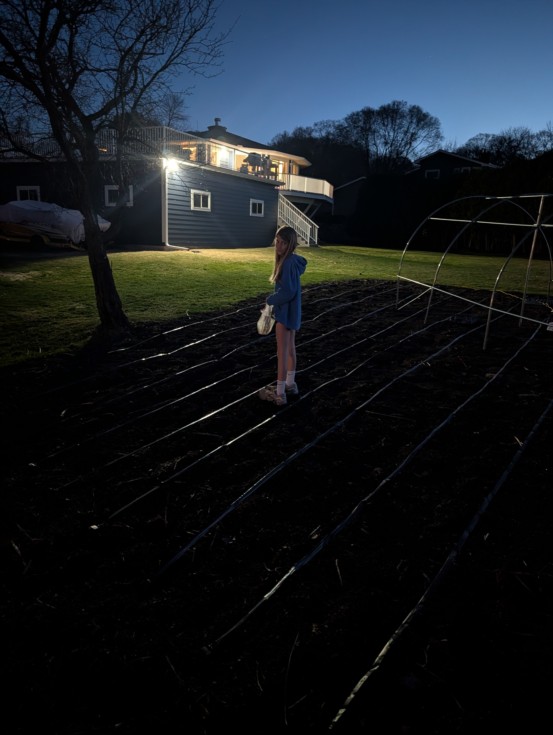 Nothing like working till last light to get the drip lines installed. Actually may have a kid helper this year! Nothing warms the heart like "Dad, I think I want to do this with you full time." We'll see how that holds up when it's 100 degrees and humid and weeds need pulling. Seriously, though, put a pair of my shoes on a 10 year old is a good way to avoid soil compaction.