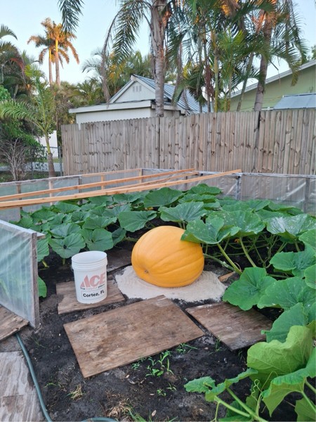 I hope to add some amendments tomorrow that I picked up and get a til in, and position the cold frame set up before the cooler weather returns. Florida Tim sent a new pic of his 1765. The pumpkin is growing and looks to be maintaining great shape and color.